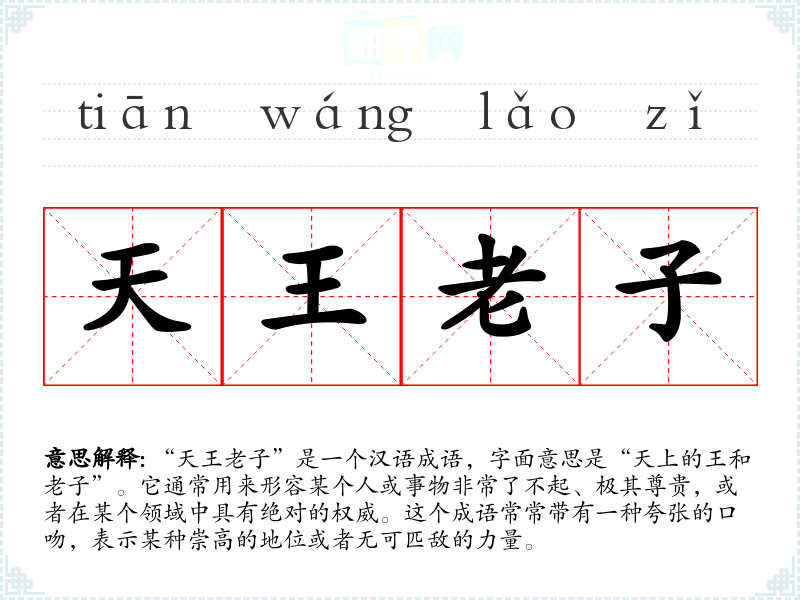 “天王老子”是一个汉语成语,字面意思是“天上的王和老子”。它通常用来形容某个人或事物非常了不起、极其尊贵,或者在某个领域中具有绝对的权威。这个成语常常带有一种夸张的口吻,表示某种崇高的地位或者无可匹敌的力量。