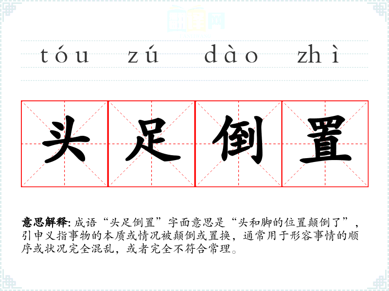 成语“头足倒置”字面意思是“头和脚的位置颠倒了”,引申义指事物的本质或情况被颠倒或置换,通常用于形容事情的顺序或状况完全混乱,或者完全不符合常理。