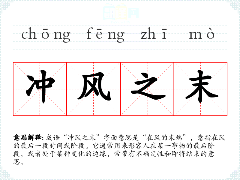 成语“冲风之末”字面意思是“在风的末端”,意指在风的最后一段时间或阶段。它通常用来形容人在某一事物的最后阶段,或者处于某种变化的边缘,常带有不确定性和即将结束的意思。