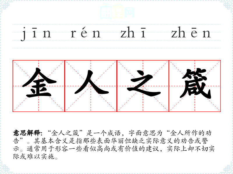 “金人之箴”是一个成语,字面意思为“金人所作的劝告”。其基本含义是指那些表面华丽但缺乏实际意义的劝告或警示。通常用于形容一些看似高尚或有价值的建议,实际上却不切实际或难以实施。