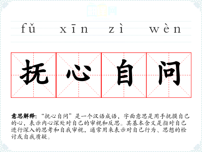 | 抚心自问 | 摸着自己的胸口问问自己。表示自我反省。 |