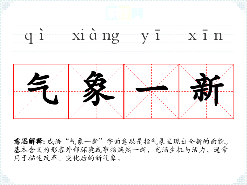 成语“气象一新”字面意思是指气象呈现出全新的面貌。基本含义为形容外部环境或事物焕然一新,充满生机与活力,通常用于描述改革、变化后的新气象。