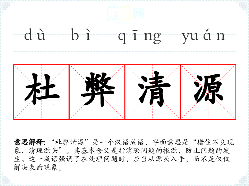 “杜弊清源”是一个汉语成语,字面意思是“堵住不良现象,清理源头”。其基本含义是指消除问题的根源,防止问题的发生。这一成语强调了在处理问题时,应当从源头入手,而不是仅仅解决表面现象。