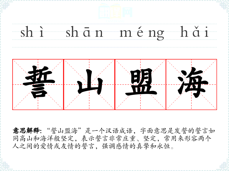“誓山盟海”是一个汉语成语,字面意思是发誓的誓言如同高山和海洋般坚定,表示誓言非常庄重、坚定,常用来形容两个人之间的爱情或友情的誓言,强调感情的真挚和永恒。