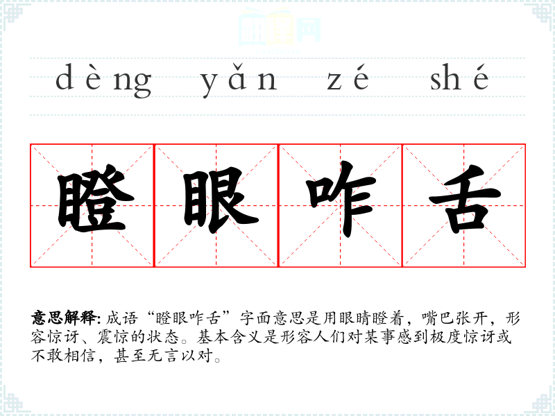 成语“瞪眼咋舌”字面意思是用眼睛瞪着,嘴巴张开,形容惊讶、震惊的状态。基本含义是形容人们对某事感到极度惊讶或不敢相信,甚至无言以对。