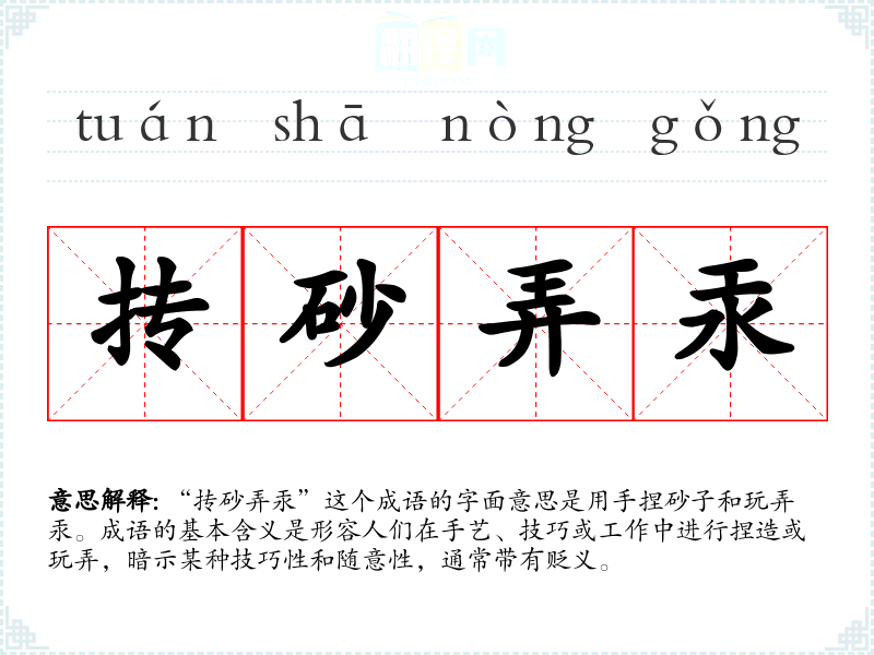 “抟砂弄汞”这个成语的字面意思是用手捏砂子和玩弄汞。成语的基本含义是形容人们在手艺、技巧或工作中进行捏造或玩弄,暗示某种技巧性和随意性,通常带有贬义。