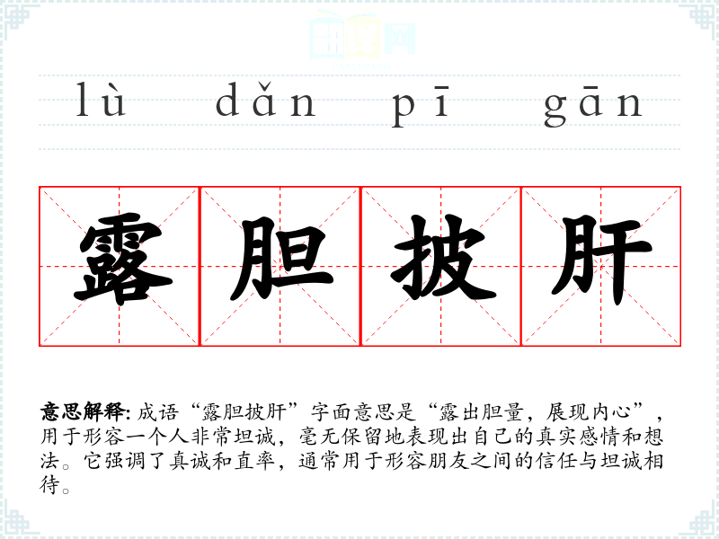 成语“露胆披肝”字面意思是“露出胆量,展现内心”,用于形容一个人非常坦诚,毫无保留地表现出自己的真实感情和想法。它强调了真诚和直率,通常用于形容朋友之间的信任与坦诚相待。