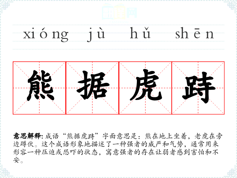 成语“熊据虎跱”字面意思是:熊在地上坐着,**在旁边蹲伏。这个成语形象地描述了一种强者的威严和气势,通常用来形容一种压迫或恐吓的状态,寓意强者的存在让弱者感到害怕和不安。