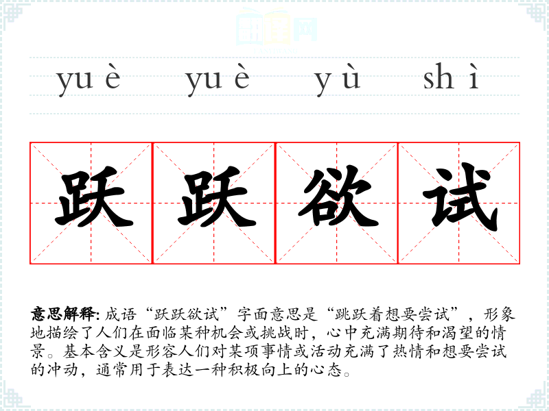 - 日常对话:朋友之间可以用来表达对新活动的期待,比如“听说这个新游戏很好玩,我也跃跃欲试。”