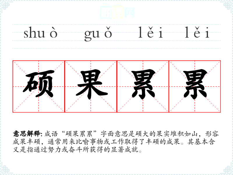 成语“硕果累累”字面意思是硕大的果实堆积如山,形容成果丰硕,通常用来比喻事物或工作取得了丰硕的成果。其基本含义是指通过努力或奋斗所获得的显著成就。