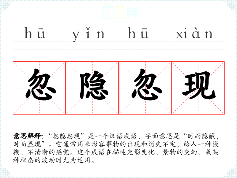 “忽隐忽现”是一个汉语成语,字面意思是“时而隐蔽,时而显现”。它通常用来形容事物的出现和消失不定,给人一种模糊、不清晰的感觉。这个成语在描述光影变化、景物的变幻、或某种状态的波动时尤为适用。