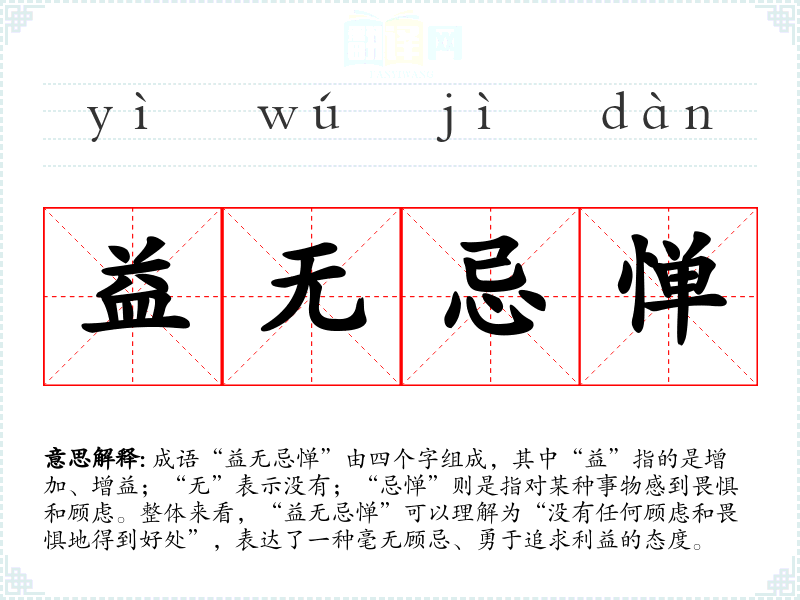 成语“益无忌惮”由四个字组成,其中“益”指的是增加、增益;“无”表示没有;“忌惮”则是指对某种事物感到畏惧和顾虑。整体来看,“益无忌惮”可以理解为“没有任何顾虑和畏惧地得到好处”,表达了一种毫无顾忌、勇于追求利益的态度。