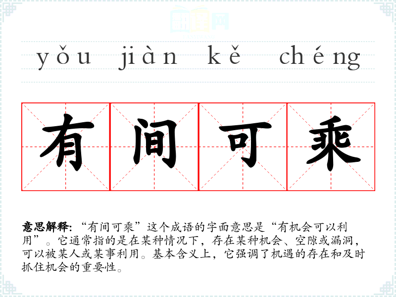 “有间可乘”这个成语的字面意思是“有机会可以利用”。它通常指的是在某种情况下,存在某种机会、空隙或漏洞,可以被某人或某事利用。基本含义上,它强调了机遇的存在和及时抓住机会的重要性。