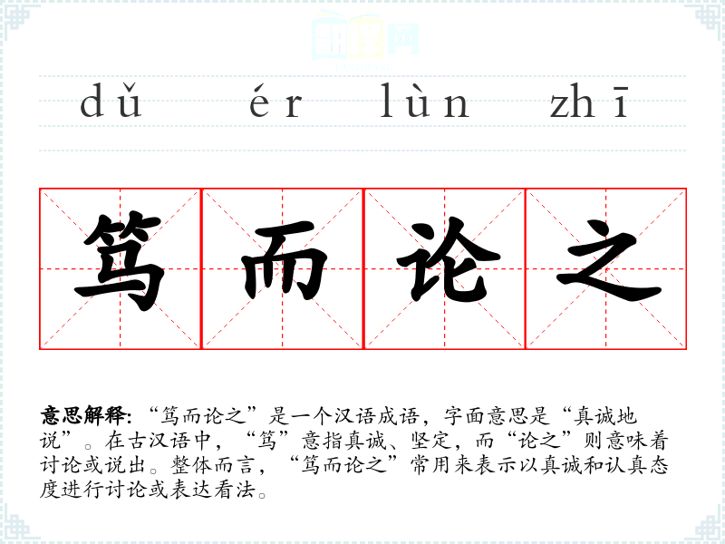 “笃而论之”是一个汉语成语,字面意思是“真诚地说”。在古汉语中,“笃”意指真诚、坚定,而“论之”则意味着讨论或说出。整体而言,“笃而论之”常用来表示以真诚和认真态度进行讨论或表达看法。