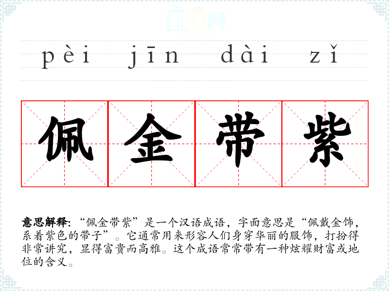 “佩金带紫”的成语来源于古代的服饰文化。在古代,金饰和紫色带子通常是贵族和达官显贵的象征。金色象征着财富与权力,而紫色则多与尊贵和高雅相关联。这个成语体现了对富贵生活的描绘,尤其是在古代,穿着华丽的服装是地位和身份的明显标志。