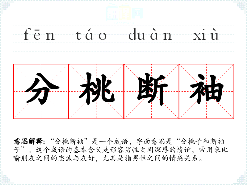 “分桃断袖”是一个成语,字面意思是“分桃子和断袖子”。这个成语的基本含义是形容男性之间深厚的情谊,常用来比喻朋友之间的忠诚与友好,尤其是指男性之间的情感关系。