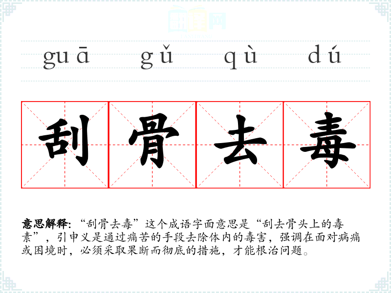 “刮骨去毒”这个成语字面意思是“刮去骨头上的毒素”,引申义是通过痛苦的手段去除体内的毒害,强调在面对病痛或困境时,必须采取果断而彻底的措施,才能根治问题。