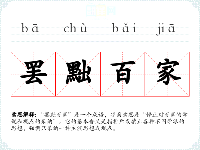 “罢黜百家”是一个成语,字面意思是“停止对百家的学说和观点的采纳”。它的基本含义是指排斥或禁止各种不同学派的思想,强调只采纳一种主流思想或观点。
