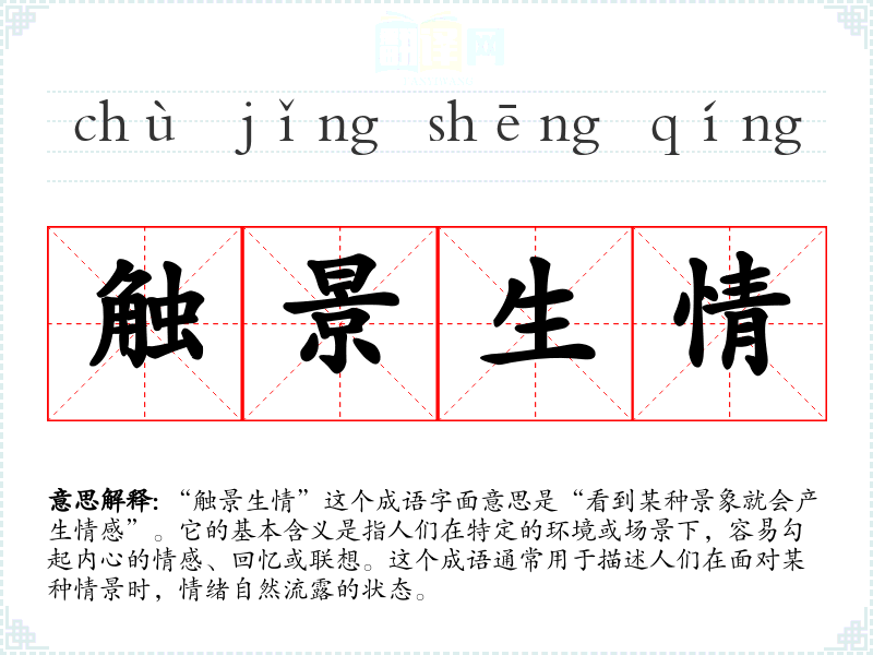“触景生情”这个成语字面意思是“看到某种景象就会产生情感”。它的基本含义是指人们在特定的环境或场景下,容易勾起内心的情感、回忆或联想。这个成语通常用于描述人们在面对某种情景时,情绪自然流露的状态。