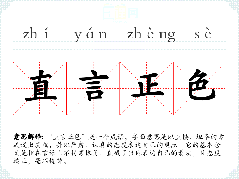 “直言正色”是一个成语,字面意思是以直接、坦率的方式说出真相,并以严肃、认真的态度表达自己的观点。它的基本含义是指在言语上不拐弯抹角,直截了当地表达自己的看法,且态度端正,毫不掩饰。