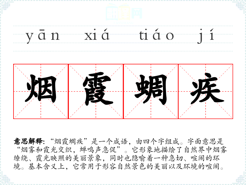 该成语的来源可以追溯到古代文人对自然景色的描写。虽然没有确切的历史典故,但在古代诗词中,烟霞常用来描绘山水的壮丽,而蜩(蝉)则象征夏季的喧闹。成语结合了这两种意象,形成了独特的表达。