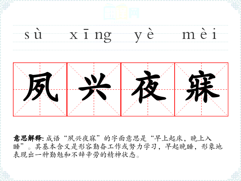 在不同的语境下,“夙兴夜寐”可以用来描述个人的努力工作状态,也可以用来形容一个团队或集体的奋斗精神。例如,在文学作品中,描述一个勤奋的学子;在日常对话中,形容自己为工作而早起晚睡;在演讲中,激励他人要努力奋斗。