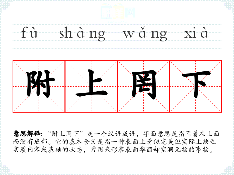 “附上罔下”是一个汉语成语,字面意思是指附着在上面而没有底部。它的基本含义是指一种表面上看似完美但实际上缺乏实质内容或基础的状态,常用来形容表面华丽却空洞无物的事物。