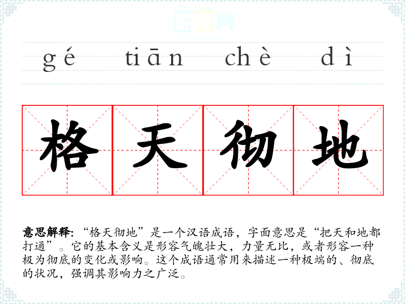 “格天彻地”是一个汉语成语,字面意思是“把天和地都打通”。它的基本含义是形容气魄壮大,力量无比,或者形容一种极为彻底的变化或影响。这个成语通常用来描述一种极端的、彻底的状况,强调其影响力之广泛。