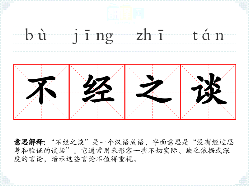 “不经之谈”是一个汉语成语,字面意思是“没有经过思考和验证的谈话”。它通常用来形容一些不切实际、缺乏依据或深度的言论,暗示这些言论不值得重视。