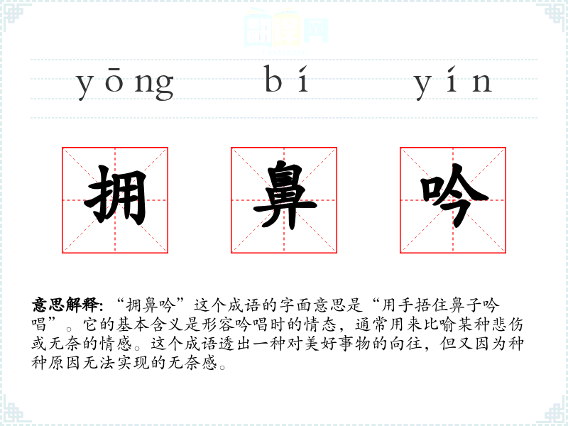 “拥鼻吟”这个成语的字面意思是“用手捂住鼻子吟唱”。它的基本含义是形容吟唱时的情态,通常用来比喻某种悲伤或无奈的情感。这个成语透出一种对美好事物的向往,但又因为种种原因无法实现的无奈感。
