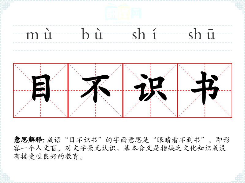 成语“目不识书”的字面意思是“眼睛看不到书”,即形容一个人文盲,对文字毫无认识。基本含义是指缺乏文化知识或没有接受过良好的教育。