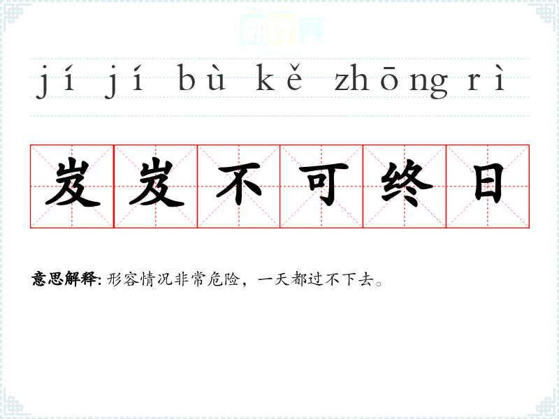 | 不可终日 | 终日:从早到晚,一天。一天都过不下去。形容局势危急或心中极其恐慌不安。 |