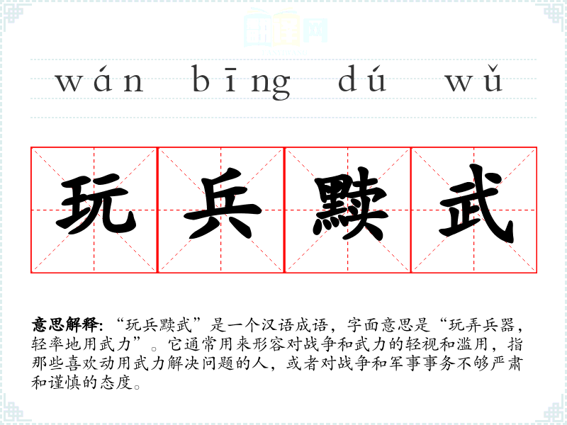 “玩兵黩武”是一个汉语成语,字面意思是“玩弄兵器,轻率地用武力”。它通常用来形容对战争和武力的轻视和滥用,指那些喜欢动用武力解决问题的人,或者对战争和军事事务不够严肃和谨慎的态度。