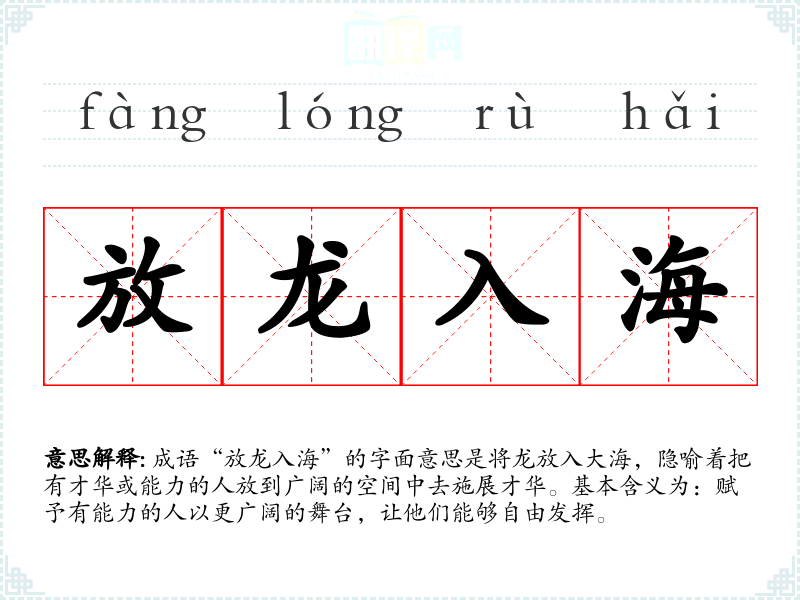 成语“放龙入海”的字面意思是将龙放入大海,隐喻着把有才华或能力的人放到广阔的空间中去施展才华。基本含义为:赋予有能力的人以更广阔的舞台,让他们能够自由发挥。