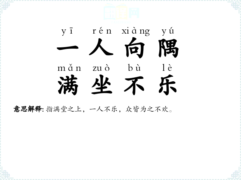 隅:角落。一个人朝着屋角创造性落泪,屋里的人都不高兴。形容在公共聚会中因一个人的不悦影响了整个气氛。 |