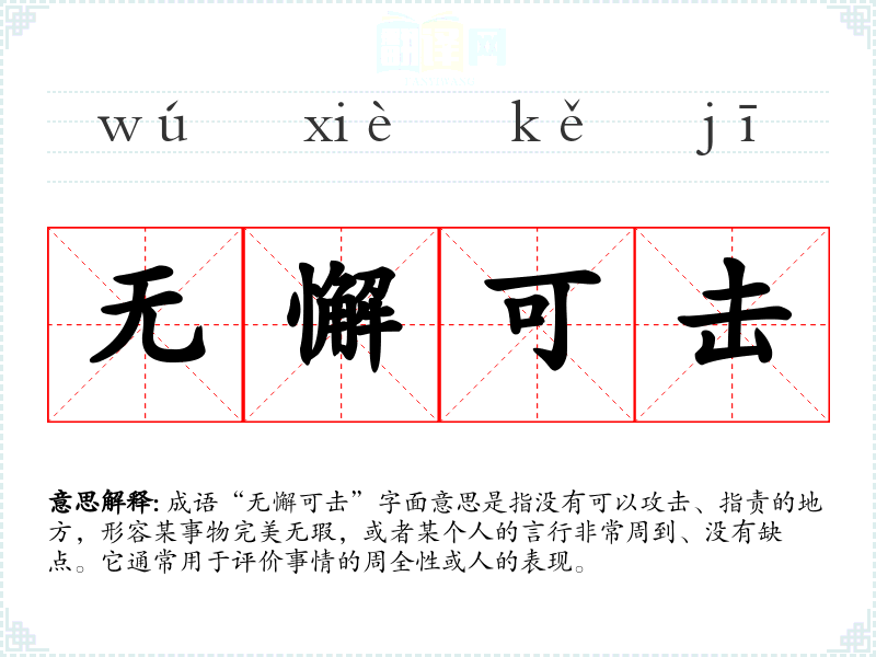 成语“无懈可击”字面意思是指没有可以攻击、指责的地方,形容某事物完美无瑕,或者某个人的言行非常周到、没有缺点。它通常用于评价事情的周全性或人的表现。