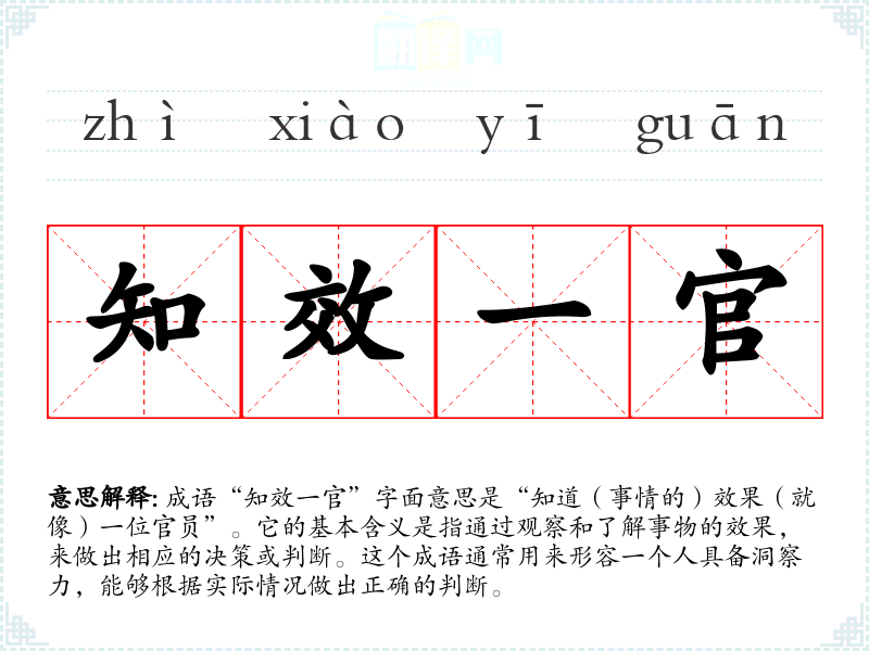 成语“知效一官”字面意思是“知道(事情的)效果(就像)一位官员”。它的基本含义是指通过观察和了解事物的效果,来做出相应的决策或判断。这个成语通常用来形容一个人具备洞察力,能够根据实际情况做出正确的判断。