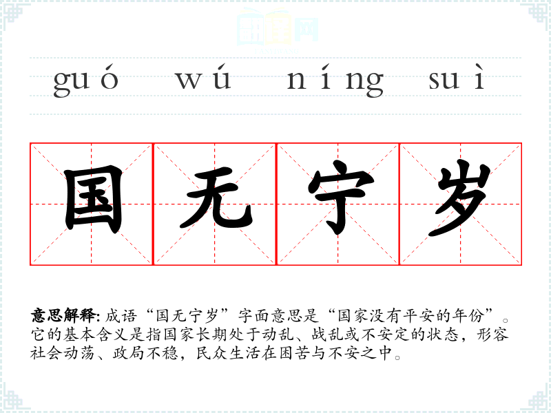 成语“国无宁岁”字面意思是“国家没有平安的年份”。它的基本含义是指国家长期处于动乱、战乱或不安定的状态,形容社会动荡、政局不稳,民众生活在困苦与不安之中。
