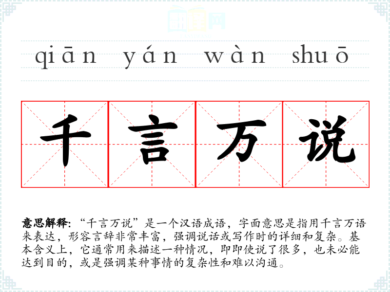 “千言万说”是一个汉语成语,字面意思是指用千言万语来表达,形容言辞非常丰富,强调说话或写作时的详细和复杂。基本含义上,它通常用来描述一种情况,即即使说了很多,也未必能达到目的,或是强调某种事情的复杂性和难以沟通。