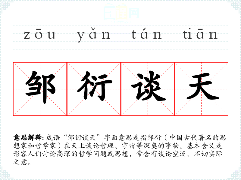 “邹衍”是春秋时期的哲学家和道家代表人物之一,他的思想对后来的道教和哲学发展有着重要影响。成语的来源可能与他在《淮南子》等古籍中的论述有关,强调了对宇宙和人生的思考。成语中提到的“谈天”更加强调了讨论的内容是宇宙和哲学层面的。