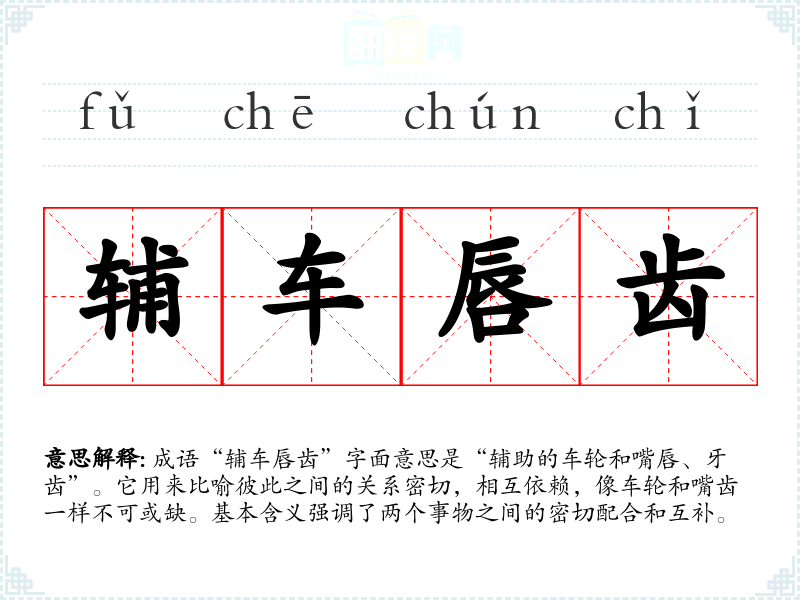 “辅车唇齿”出自《左传》,原文为“辅车相依,唇齿相依”。这句话描绘了车轮与车身、嘴唇与牙齿之间的关系,强调它们是相辅相成、不可分割的。历史上,这个成语常用来形容人与人之间、事物与事物之间的紧密联系。