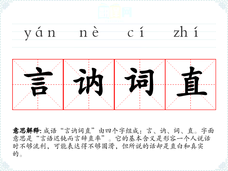 成语“言讷词直”由四个字组成:言、讷、词、直。字面意思是“言语迟钝而言辞直率”。它的基本含义是形容一个人说话时不够流利,可能表达得不够圆滑,但所说的话却是直白和真实的。