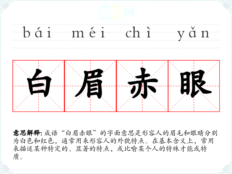 成语“白眉赤眼”的字面意思是形容人的眉毛和眼睛分别为白色和红色,通常用来形容人的外貌特点。在基本含义上,常用来描述某种特定的、显著的特点,或比喻某个人的特殊才能或特质。