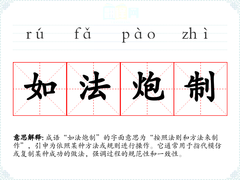 成语“如法炮制”的字面意思为“按照法则和方法来制作”,引申为依照某种方法或规则进行操作。它通常用于指代模仿或复制某种成功的做法,强调过程的规范性和一致性。
