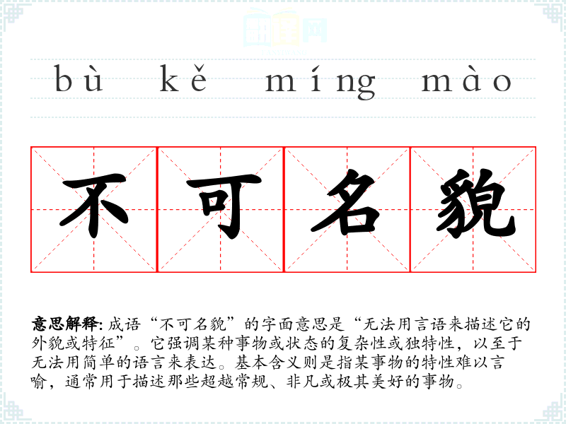 - 文学作品:在诗歌或散文中,常用“不可名貌”来形容美好的风景、情感或深邃的哲理。例如,描写一幅自然景观时,可以说:“这片山水,真是不可名貌,令人心醉神迷。”