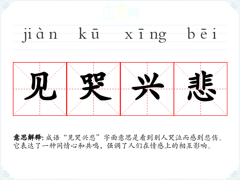 成语“见哭兴悲”字面意思是看到别人哭泣而感到悲伤。它表达了一种同情心和共鸣,强调了人们在情感上的相互影响。