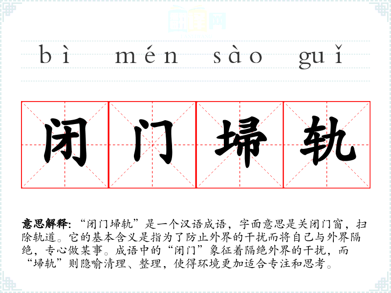 “闭门埽轨”是一个汉语成语,字面意思是关闭门窗,扫除轨道。它的基本含义是指为了防止外界的干扰而将自己与外界隔绝,专心做某事。成语中的“闭门”象征着隔绝外界的干扰,而“埽轨”则隐喻清理、整理,使得环境更加适合专注和思考。