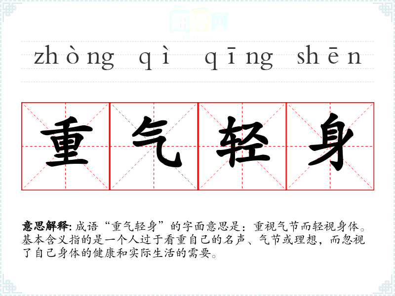 成语“重气轻身”的字面意思是:重视气节而轻视身体。基本含义指的是一个人过于看重自己的名声、气节或理想,而忽视了自己身体的健康和实际生活的需要。