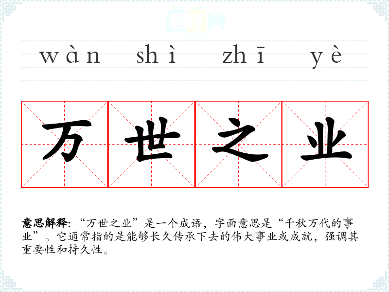 “万世之业”是一个成语,字面意思是“千秋万代的事业”。它通常指的是能够长久传承下去的伟大事业或成就,强调其重要性和持久性。