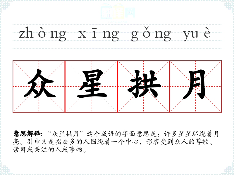 | 众星拱辰 | 拱:环绕,拱卫;辰:指北极星。天上众星拱卫北辰。旧指有德的国君在位,得到天下臣民的拥戴。后也比喻四方归向一处。 |